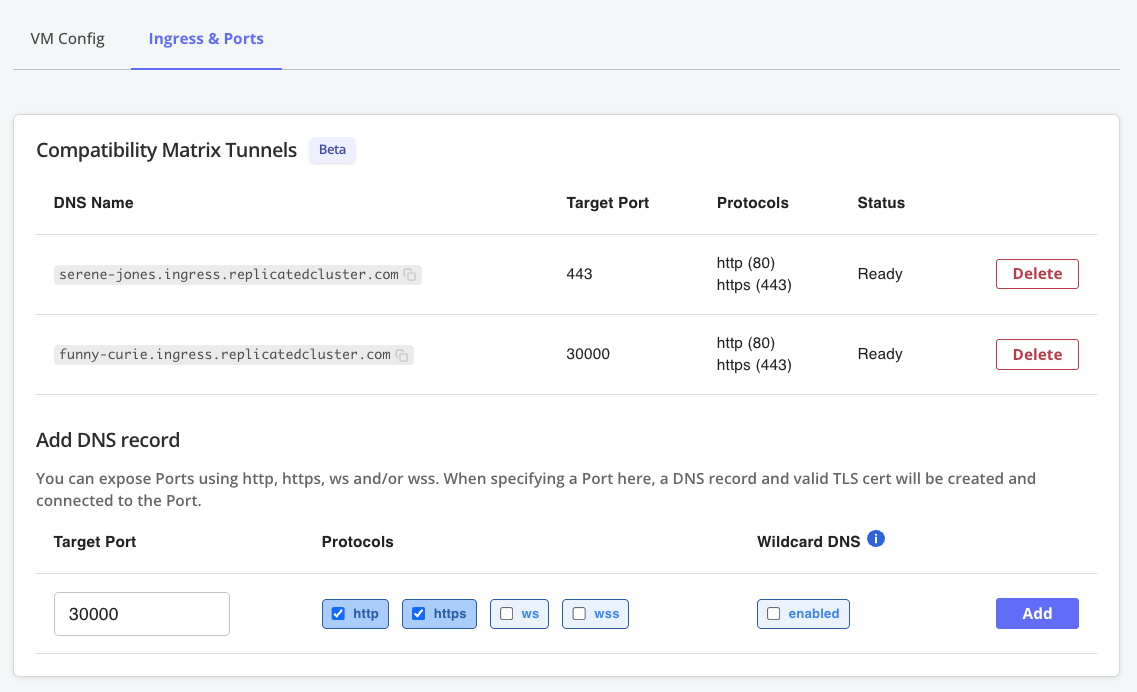 • If you created the VM with CMX, enter the URL that you copied for the DNS record with a target port of 443. For example, pensive-keldysh.ingress.replicatedcluster.com.