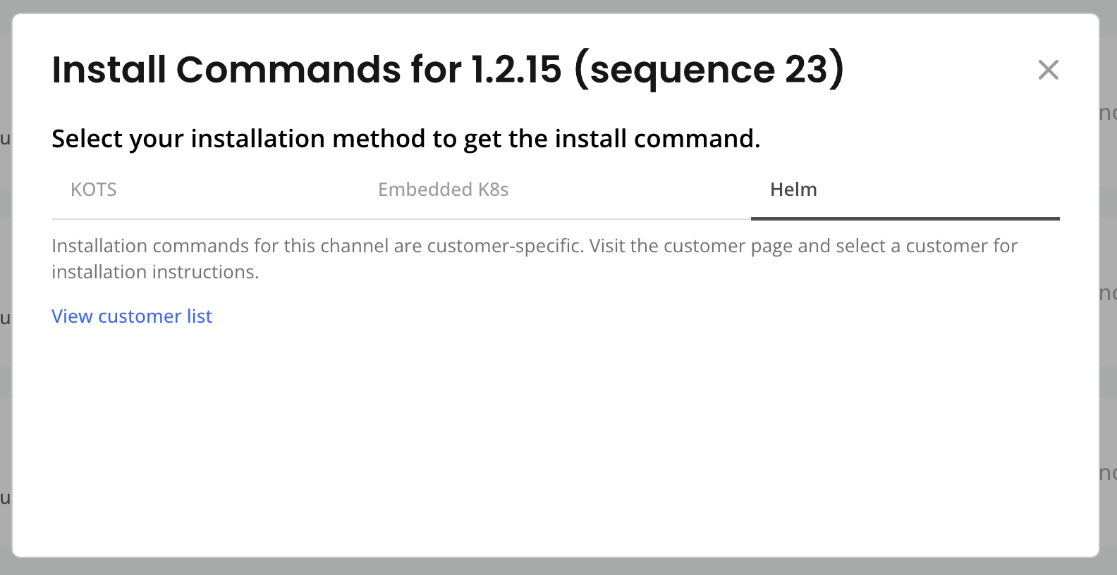 Installation instructions for the Helm CLI and Replicated Embedded Cluster are customer-specific. You can find installation instructions on the page for the target customer.
